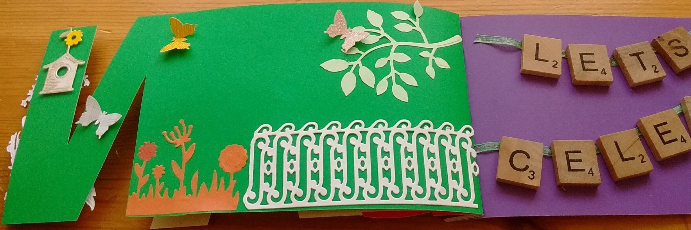 E: bird house, butterflies, flowers and fence. ‘Let’s celebrate’ wooden scrabble letter tiles with ribbon to look like bunting. Foil cake with candles, foil ‘ Happy Birthday’ greeting, balloons, mini bows and wire, net & jewel butterfly.